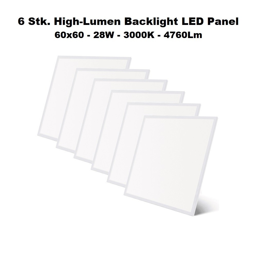 Du køber her 6 x High-Lumen Backlight LED Panel 60 ×60 På 28W i 3000KOplev vores super effektive Back-Light LED-panel med imponerende 170 lumen pr. Watt og en varm hvid lysfarve på 3000K alt dette med 28W strømforbrugDen varme hvide lysfarve på